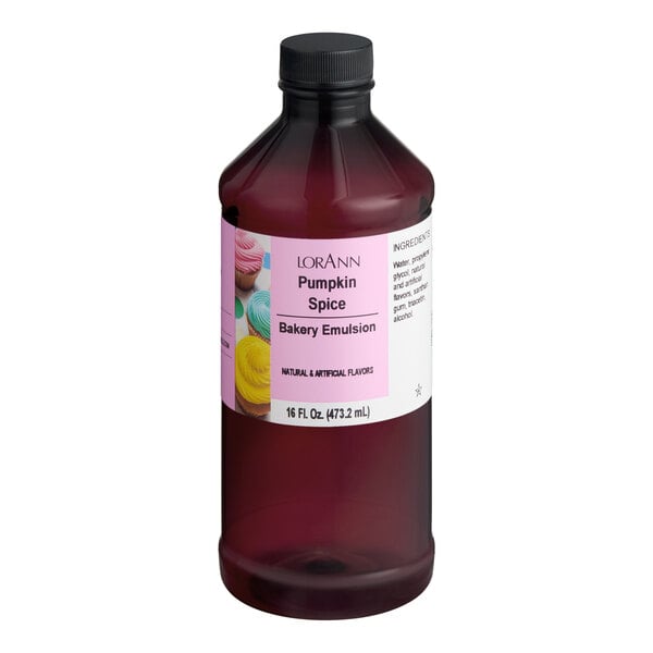 Add a warm pumpkin pie flavor to your baked goods and frostings with this LorAnn Oils 16 fl. oz. pumpkin spice bakery emulsion! Preferred by pastry chefs and bakers for their superior results, emulsions are flavorings that are suspended in a water base to deliver richer, more flavorful baked goods than alcohol-based extracts. Because water does not evaporate as quickly as alcohol when exposed to heat, this emulsion will retain its strength and won't bake-out during the baking process, resulting in foods with a more robust pumpkin spice flavor and aroma. Perfect for high-heat and no-bake applications, use this versatile emulsion to bring delicious flavor to cakes, cookies, and sweet breads as well as frostings, glazes, fondants, fillings, and cream centers. You can even add to coffee and shakes to create full-flavored beverages for your specialty menu or into your pancake and waffle batter! No matter how you choose to use it, this emulsion is sure to become an essential ingredient in your kitchen.