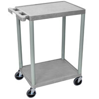 Thanks to 2 3/4" deep bottom tub shelf, this gray Luxor STC21-G two shelf utility cart is the perfect transportation solution at your restaurant, banquet hall, or catered event. Move food, dishes, janitorial supplies, and more with ease! Made of high density polyethylene, this cart's molded plastic shelves and legs will not stain, scratch, dent, or rust. Its top flat shelf features a retaining lip.