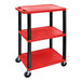 Safely and quickly transport products, supplies, and equipment with this Luxor powered 3-shelf utility cart! This mobile cart is made with durable molded plastic that resists scratches, dents, stains, and rust with 1 1/2" square black legs and holds up to 300 lb. total of evenly distributed weight. It features (3) 24" x 18" shelves for holding anything from boxes or A/V equipment to office supplies (sold separately). Each red injection-molded thermoplastic resin shelf features a textured surface and 1/4" retaining lip to prevent your supplies from sliding or falling during transport. This item features a 16 1/2" clearance between shelves to ensure ample room for transporting large items. This utility cart is great for transporting large, heavy loads with ease.