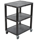 Safely and quickly transport a vast range of products, supplies, and equipment with this Luxor WT34S black three shelf utility cart! Thanks to its high density polyethylene foam-injection molded plastic construction, this cart provides exceptional durability and is resistant to rusting, dents, scratches, and stains to ensure long-lasting reliability. This multi-purpose cart features (3) 18" x 24" shelves that are perfect for holding anything from AV equipment to bus tubs, food pans, ingredient bins, flatware, and a variety of other supplies! Plus, each shelf comes with a 1/4" retaining lip to ensure your supplies don't fall during transport, while a textured surface provides extra traction to prevent items from sliding during se.