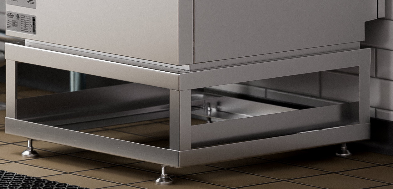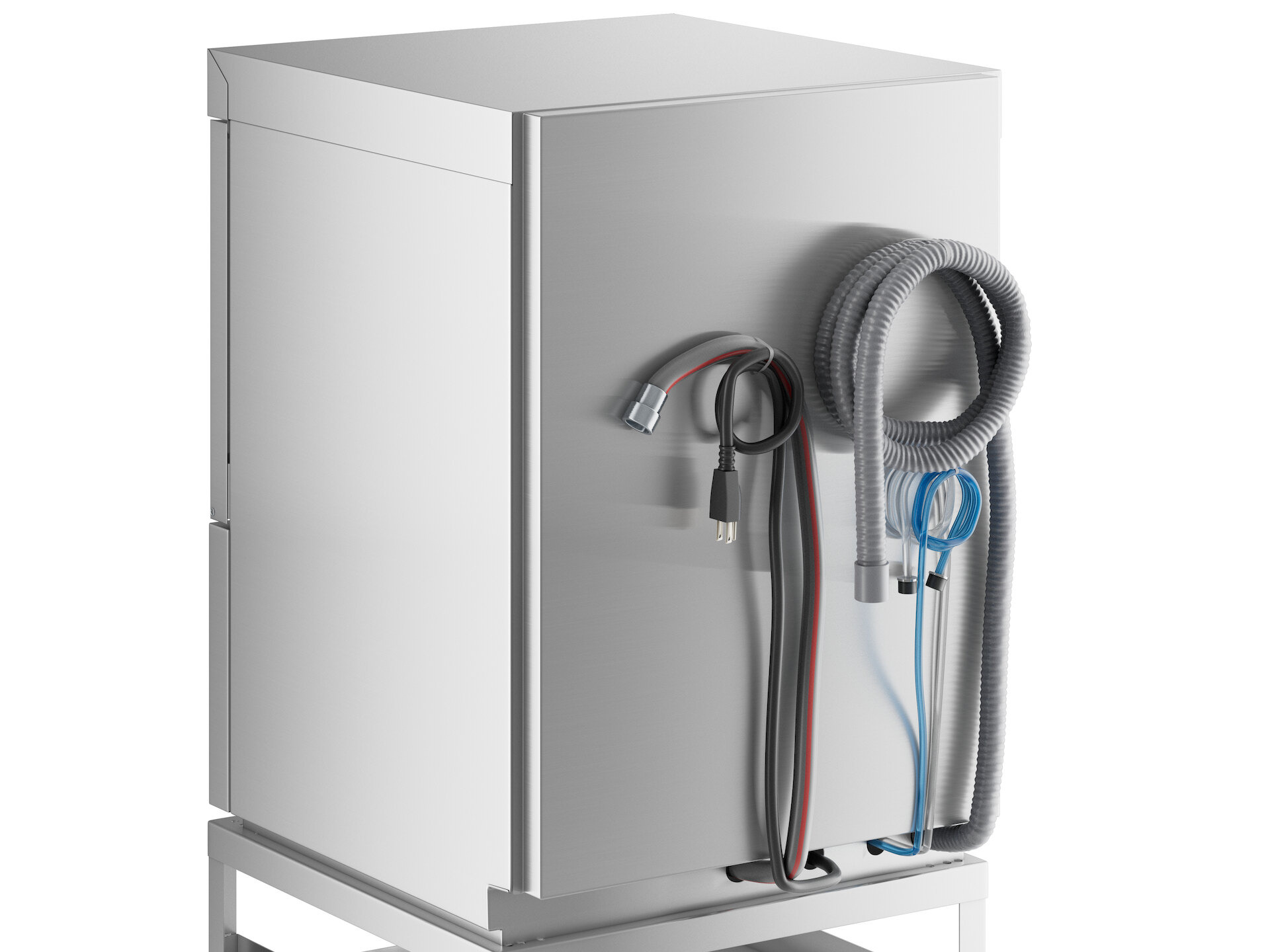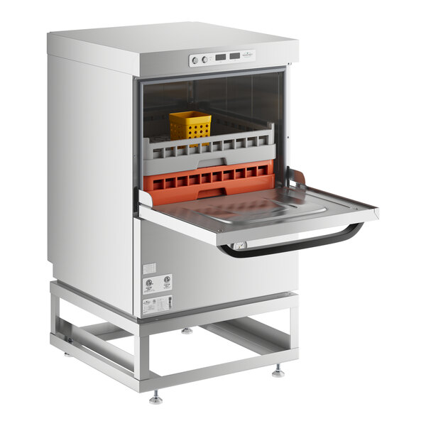 The power of this dishwasher combines with the convenience of a stand that elevates the machine and reduces strain to create an ideal asset for your busy foodservice establishment. The durable stainless steel stand has a height of 9 7/16" with adjustable feet that can raise it to 10 7/16". This unit requires a 208/240V electrical connection for operation.