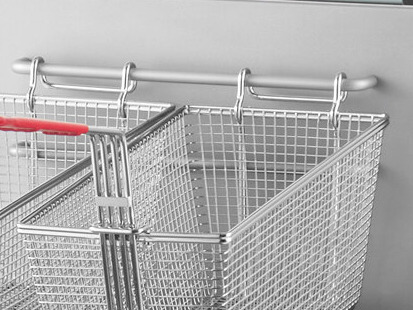 The convenient basket rails allow for quick removal from the fryer tank to drain away excess oil. They also allow you to hang the baskets at two different heights, which comes in handy when using one basket to collect items being fried with the other.