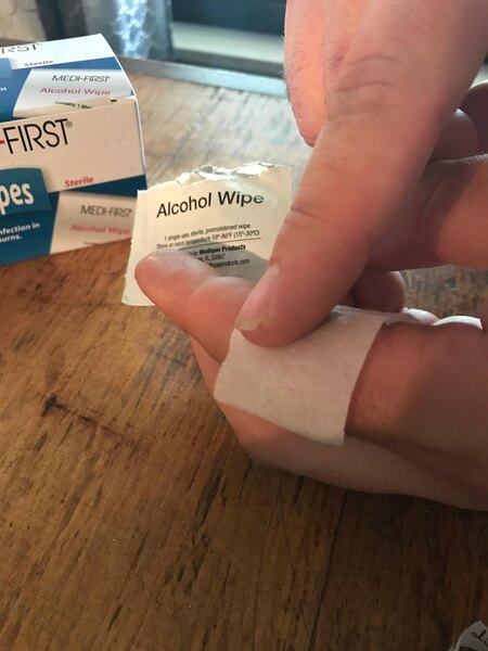 These alcohol wipes are really nice - they are fully saturated with alcohol, big enough to clean or sanitize a cut, and very conveniently individually packaged.