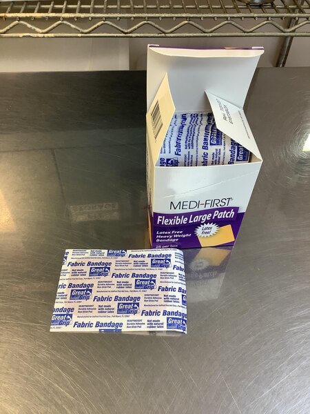 Work in and around sharp things and you will need these. The size is great since it covers a large wound and they will stick to your arm or hand. These are not the kind that peel off before your shift is done. They work.