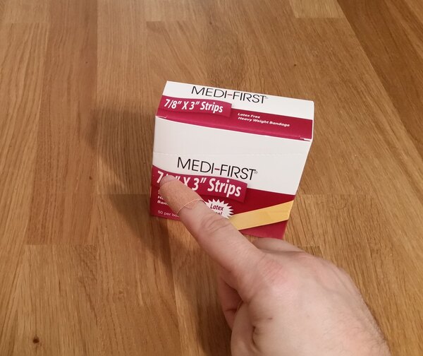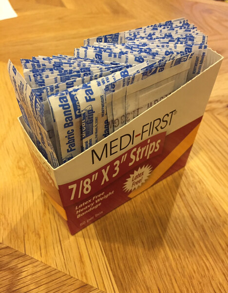 These small bandages are good with cuts or scrapes Medique 61450 Medi-First 7/8" x 3" Woven Bandage Strip - 50/Box better to fill your go medi bag