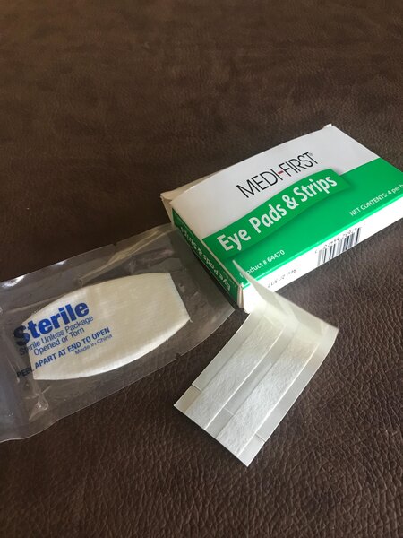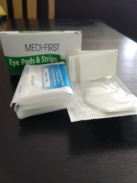 This box includes 4 eye pads and 8 adhesive strips. I was impressed by the quality of the pads, but the strips are poorly designed. They're functional, but they look a bit ridiculous and are more difficult to put on than they should be. Regardless, these are useful to have in a first aid kit for any eye-related injuries.