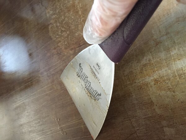 While this may look like your run of the mill scraper from any hardware store, it's not. This is built for purpose, and that is for flat top stoves. It has good weight, and does not flex, which is what you want, rigidity when scraping. The edge stands up to use, and can be sharpened to keep the edge pristine. We use this in conjunction with our two handle scraper, which we reserve for full stove scraping. This little guy is good for spot scraping in between orders. We also use it in the "gutter" to push things in the waste hold.