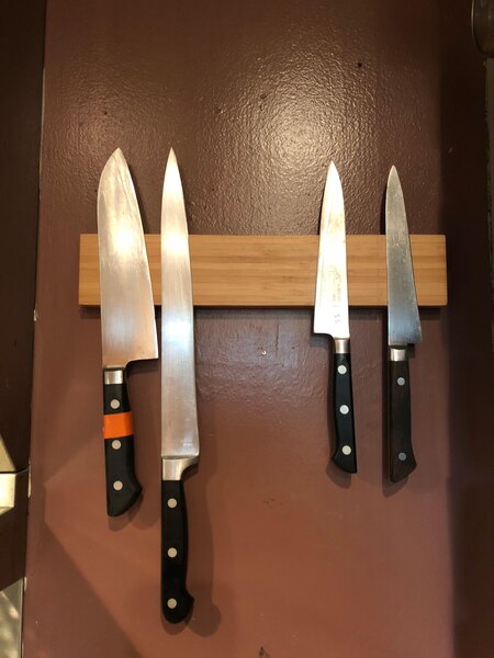 This wooden magnetic knife holder is perfect. The magnet is super strong, allows for multiple knives. It's a great space saver, and looks awesome up on the wall