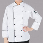 Dress your chefs in the best with this size S Mercer Culinary Renaissance® white lightweight women's executive customizable chef jacket with full black piping. Made from a 65/35 cotton-poly blend twill, this jacket is comfortable, looks professional, and is durable enough to stand up to any food service environment. Each jacket has a design which gives this jacket a professional and timeless look. Additionally, the cuffs and neck have decorative black piping for an extra stylish look.