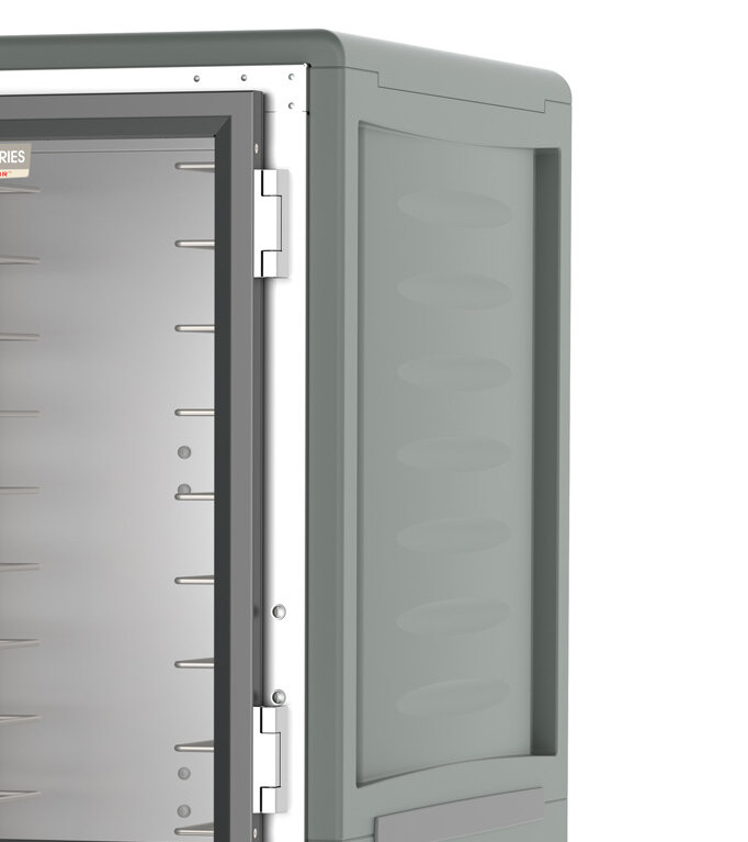 Built with patented insulation technology, this holding cabinet doesn't just retain heat, its exterior remains cool to the touch. This saves energy and as a result, saves you money. The hand holds are molded in vertically for easy maneuvering, and the exterior is made of durable gray polymer, which provides a dent-resistant, impact-resistant, and stain-resistant construction, perfect for heavy use in bustling kitchens.