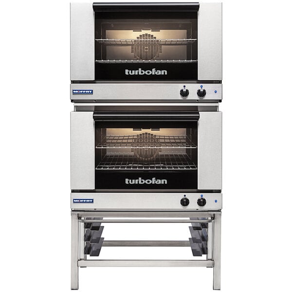 Perfect for virtually all cooking and baking applications, this Moffat Turbofan double deck full size 2 pan electric convection oven with mechanical controls and stainless steel stand is a great way to increase cooking capacity without sacrificing valuable space in your commercial kitchen! Its compact 31 7/8" width makes it great for coffee shops, kiosks, snack bars, and restaurants.