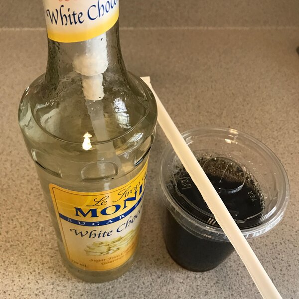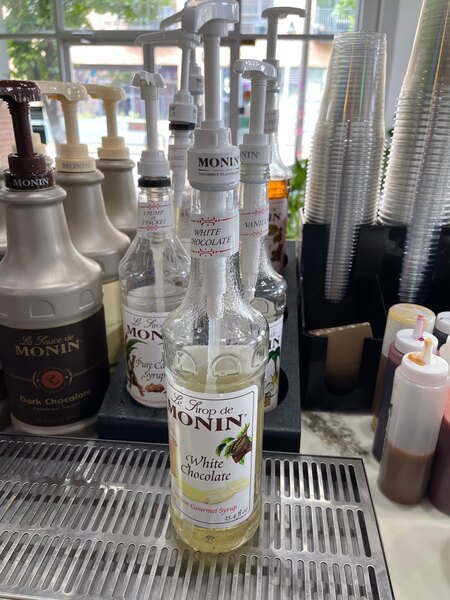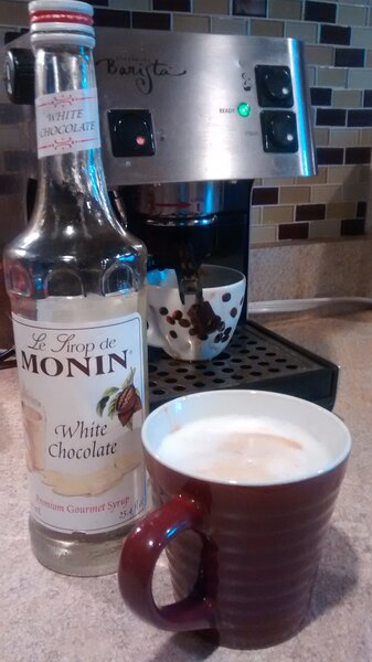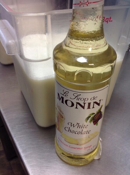 This white chocolate syrup is what we were looking for. It gives you the sweet white chocolate flavor with a thin enough texture to blend well with coffee beverages.