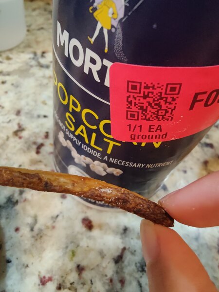I'm glad I could buy popcorn salt in a large container rather than those little disposable shakers at the grocery store! Fine powdery slat as you would expect and sticks great to fries.
