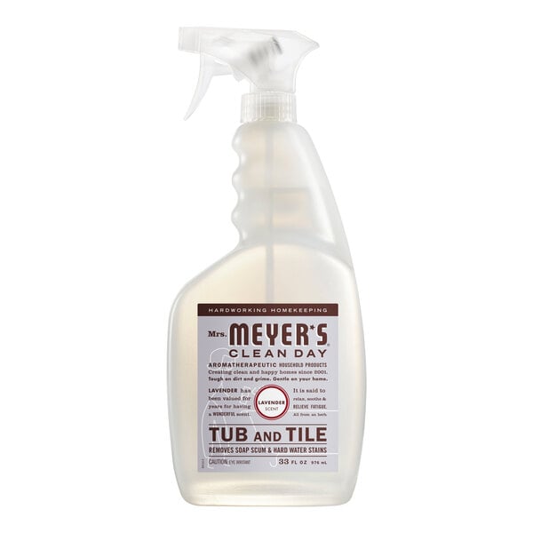 Keep your bathroom sparkling clean with the help of Mrs. Meyer's Clean Day 663009 33 fl. oz. lavender tub and tile cleaner. This hard-working cleaner dissolves calcium deposits and soap scum with the help of slightly acidic plant-derived surfactants. Enhanced with essential oils, it doesn't produce the same strong chemical odors as other tub and tile cleaners, making it better for your staff and guests alike. The light lavender scent will relax and calm, creating a calming and welcoming atmosphere naturally. This bottle features a convenient spray trigger that helps to evenly disperse the cleaner in a sweeping motion. Once surfaces are sprayed down, you may choose to scrub tough stains or thick build up. Then simply wipe the suds away to reveal fresh, clean surfaces.