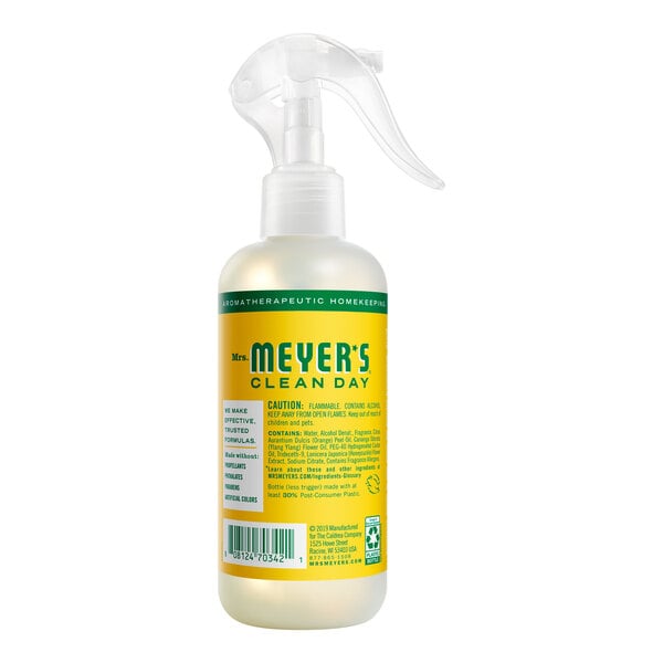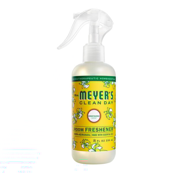 Freshen and deodorize your room or upholstered surfaces quickly with Mrs. Meyer's Clean Day 353162 8 fl. oz. honeysuckle air freshener deodorizer spray. This room freshener is a perfect choice for deodorizing without the use of harmful aerosols. The bottle is equipped with a spray trigger that allows you to make wide, sweeping applications so you can efficiently maintain the pleasant smell your guests have come to expect. Enhanced with essential oils and natural fragrances of honeysuckle, this super fine mist is sure to keep your space smelling great.
