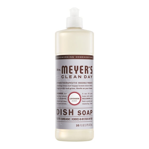 Easily get rid of tough-to-clean grease with this Mrs. Meyer's Clean Day 370041 16 oz. lavender scented dish soap! This lavender scented dish soap is specifically designed for you to be able to hand wash your pots and pans. Its concentrated and formula is meant to get at grease and other messes that are hard to clean, while being environmentally conscious and supporting a cruelty-free product that was never tested on animals. It is made of plant-derived materials so that it can rinse cleanly for spot-free dishes and glassware.