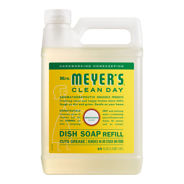 Make sure your dish washing station never runs out of soap with this Mrs. Meyer's Clean Day 372573 48 oz. honeysuckle scented dish soap refill! This jug of dish soap easily refills your regular bottle of dish soap, so when it runs out you don't have to worry. Its 48 oz. capacity contains enough soap to refill the regular 16 oz. bottle up to three times! The jug features a handle at the top to make pouring easier and safer due to the added control it provides. Be conscious of the environment by using dish soap with a concentrated, formula. Better yet, this soap is never tested on animals so you can feel good about the product you use to wash everyday items!