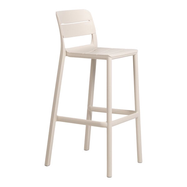As part of the Cassia collection, this barstool features stylized horizontal slats and an attractive corda beige color. Its one-piece construction is light weight and stackable, allowing for easy transportation and storage. Additionally, it has non-slip feet that keep the barstool in place. This barstool seamlessly combines style and functionality to create an inviting outdoor setting for your guests. Whether you're setting up a patio bar or a bustling restaurant terrace, this barstool is the perfect choice for adding a simple, modern touch to your outdoor dining space.