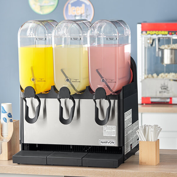 Quench your guests' thirsts and elevate the beverage service at your concession stand, buffet, or cafeteria with the Narvon triple 5 gallon bowl refrigerated beverage dispenser!
