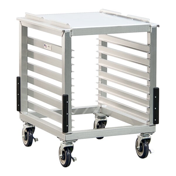 This New Age Industrial slicer / mixer stand is designed for a variety of standard food preparation applications. It is great for use as a slicer or mixer stand, mobile work surface, or pan transport cart. It features end-loading sheet pan storage, allowing it to store up to (12) 18" x 26" full-size sheet pans, platters, or trays or (24) 18" x 13" or 18" x 14" half-size sheet pans, platters, or trays. Its convenient outrigger channels create up to 6.5 sq. ft. of additional workspace, providing room for ingredients, tools, and staging.