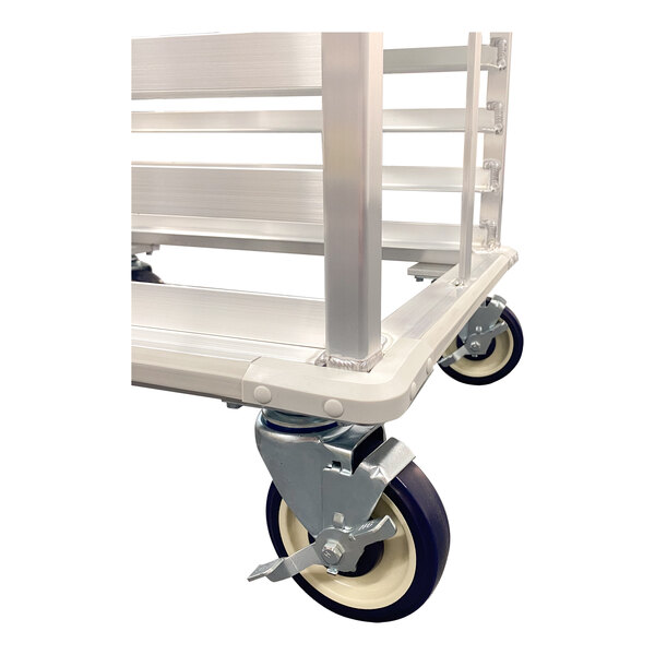This durable sheet pan rack is made of heavy-duty, high-tensile welded aluminum, which is both rust- and corrosion-resistant for commercial and industrial use. Its cross braces are reinforced with heavy-duty gussets and secured to the uprights to prevent racking. Each of its guides are horizontally and vertically welded to seal cracks and crevices that could trap dirt or bacteria. Plus, the base is reinforced at each corner for additional strength and stability. This unit rolls on (4) 5" stem-type, non-marking swivel casters with locks for smooth, quiet transport. These casters are also sealed from dirt and debris.