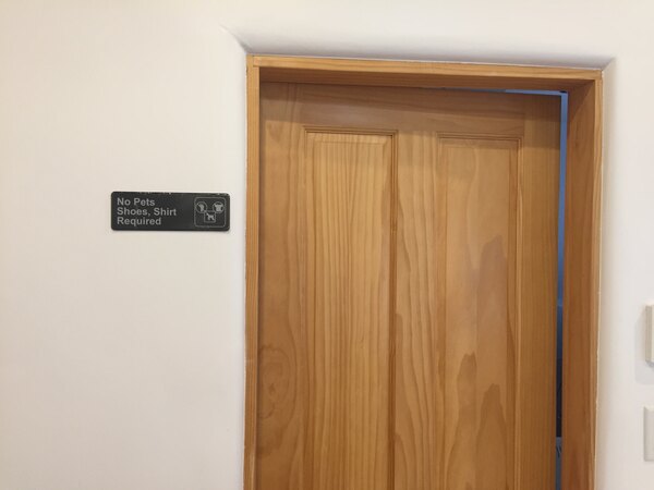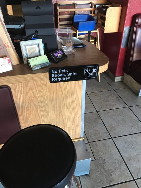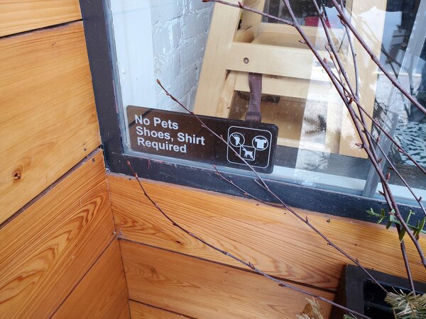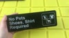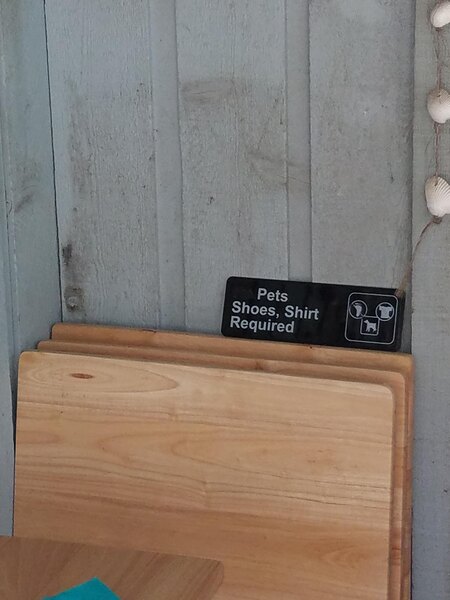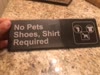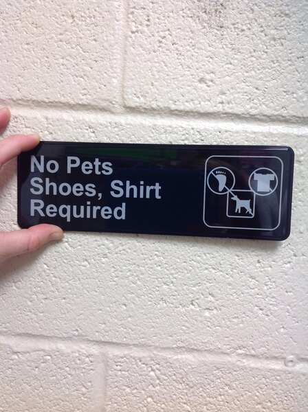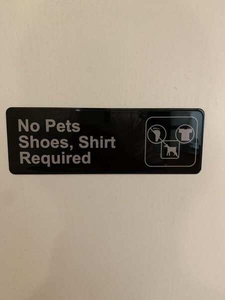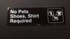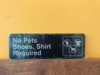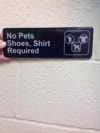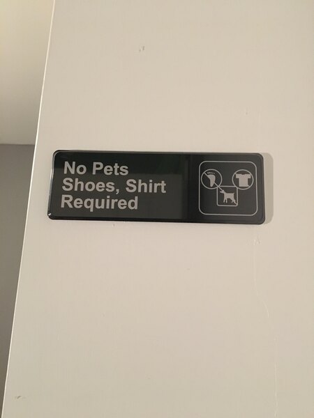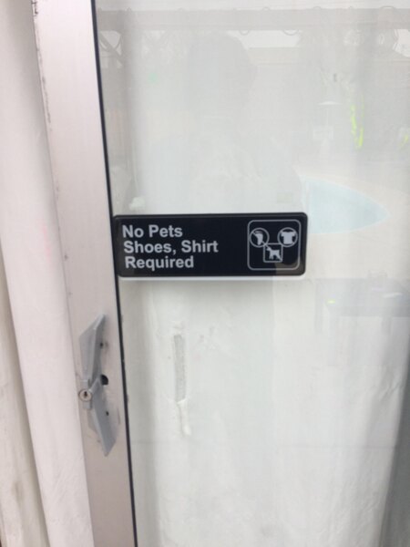 This sign should have better grammar because the way it is worded makes it sound like shoes and shirts aren’t required. Instead they should either put a period instead of a comma or reverse the order and put Shirts and shoes required, no pets allowed. People still get the message, but it seems like a silly design.
