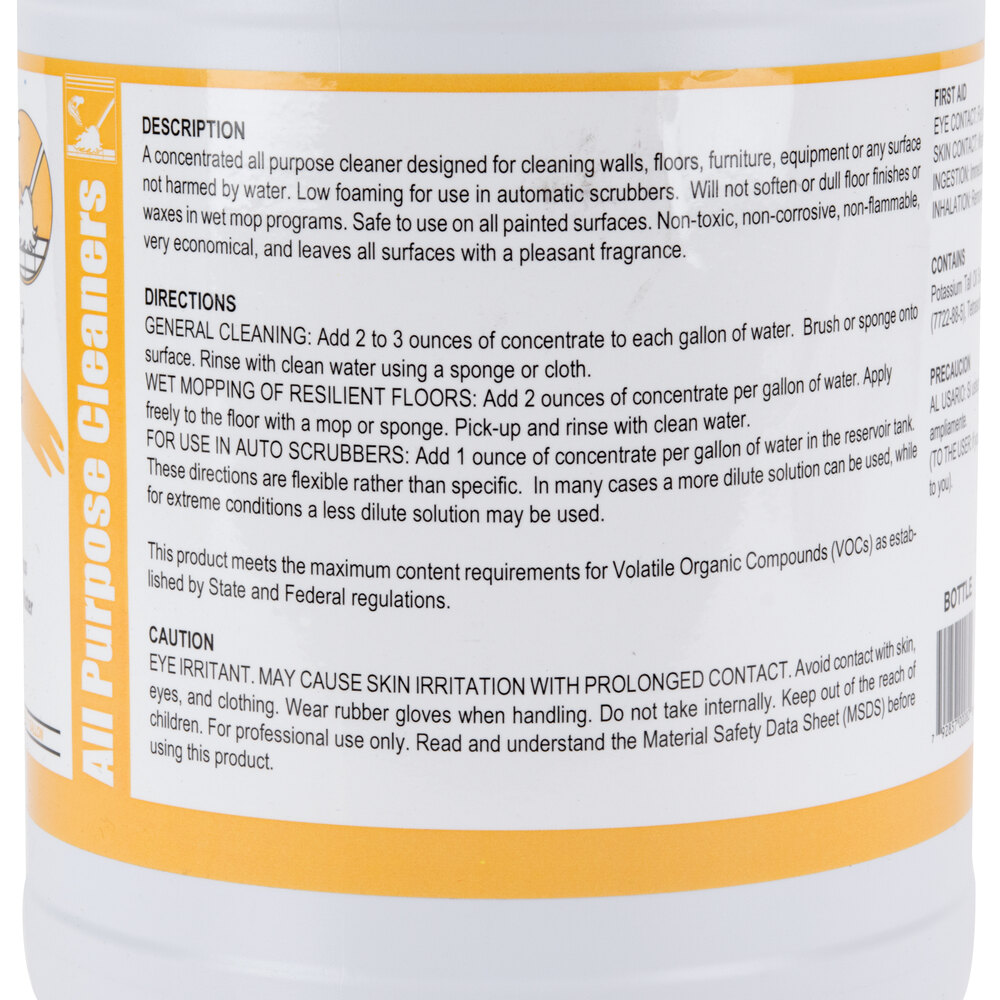 Noble's 1 gallon All Surf all-purpose liquid cleaner can clean walls, floors, furniture, and any kitchen equipment not harmed by water. This product is non-corrosive, non-flammable, and non-toxic, and its bulk size makes All Surf an economical choice for any business. Plus, it has a pleasant scent that is easy to work with.