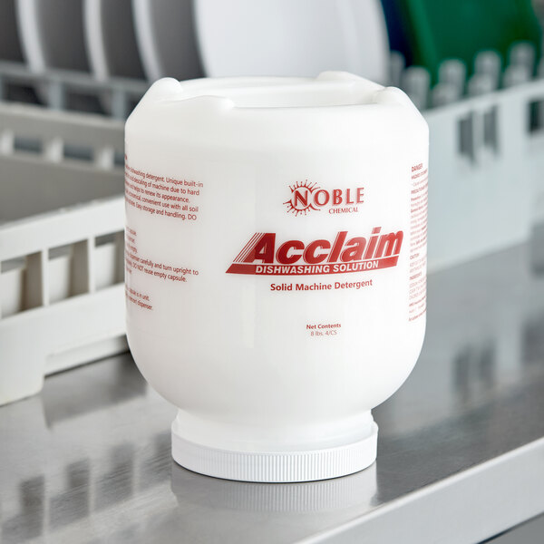 Noble's 8 lb. Acclaim solid dish machine detergent is a must-have for any commercial kitchen. This economical product is a blend of several sodium-based chemicals and can be used to wash even the dirtiest dishes or utensils. A little goes a long way when using Acclaim, and its solid form helps you dispense the perfect amount of product every time. Noble's Acclaim dish machine detergent is the perfect choice for any restaurant, cafeteria, or hospital.