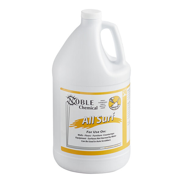 Noble's 1 gallon All Surf all-purpose liquid cleaner can clean walls, floors, furniture, and any kitchen equipment not harmed by water. This product is non-corrosive, non-flammable, and non-toxic, and its bulk size makes All Surf an economical choice for any business. Plus, it has a pleasant scent that is easy to work with.
