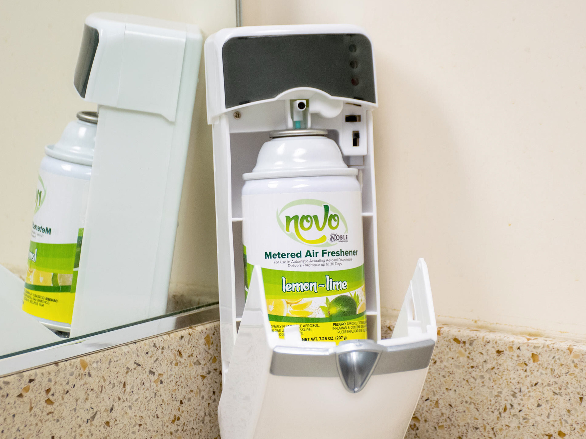 Novo 7.25 oz. Lemon-Lime Metered Air Freshener Refill - 12/Case is a great choice for catering businesses in need of a refreshing and long-lasting air freshener. The lemon-lime scent provides a pleasant aroma, and the metered design ensures a consistent and efficient distribution. The 7.25 oz. size and case of 12 make it a great value for commercial kitchens. I highly recommend it to customers who want a reliable and effective air freshener to create a pleasant environment.
