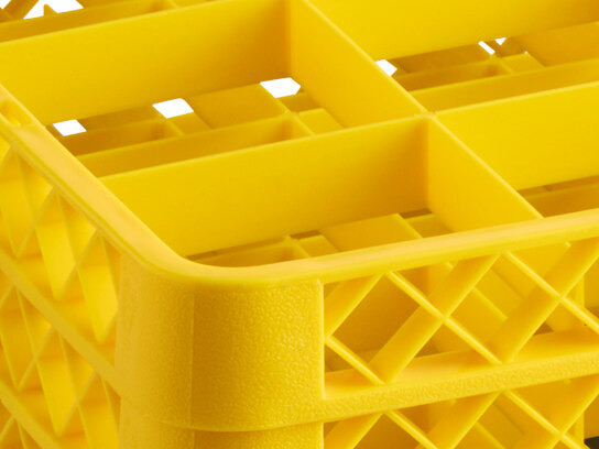 Noble 16-Compartment Gray Full-Size Glass Rack with Yellow Extender - 19 3/8" x 19 3/8" x 5 3/4" great product and durable plastic. It fit a size vases the is 4 x 4 perfectly. Glad I purchased it.