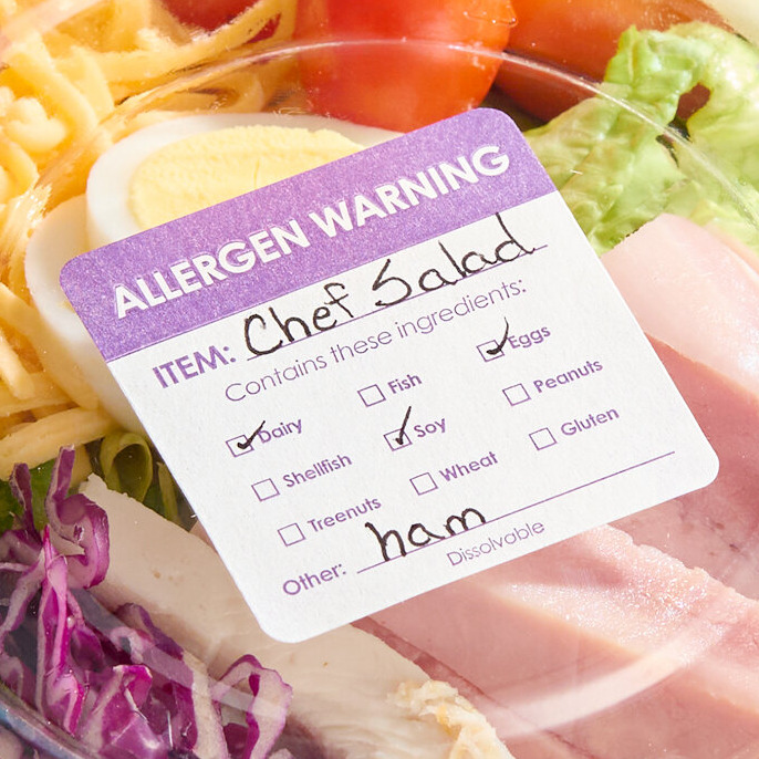 Clearly label prepared foods that contain an allergen with this Noble 2" x 2" dissolvable big 8 allergens label.