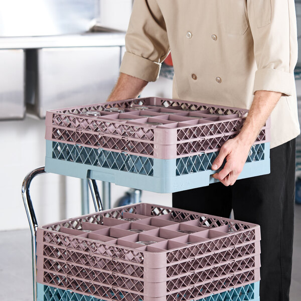 This Noble Warewashing gray full-size 20-compartment glass rack gives you the flexibility you need with the outstanding adaptability, versatility, and durability you want in today's food service establishment! With its two included brown extenders, this rack makes a great addition to a color-coded warewashing operation.
