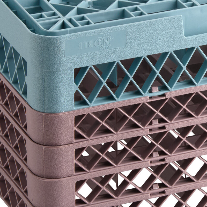 This Noble Warewashing gray full-size 20-compartment glass rack gives you the flexibility you need with the outstanding adaptability, versatility, and durability you want in today's food service establishment! With its four included brown extenders, this rack makes a great addition to a color-coded warewashing operation.