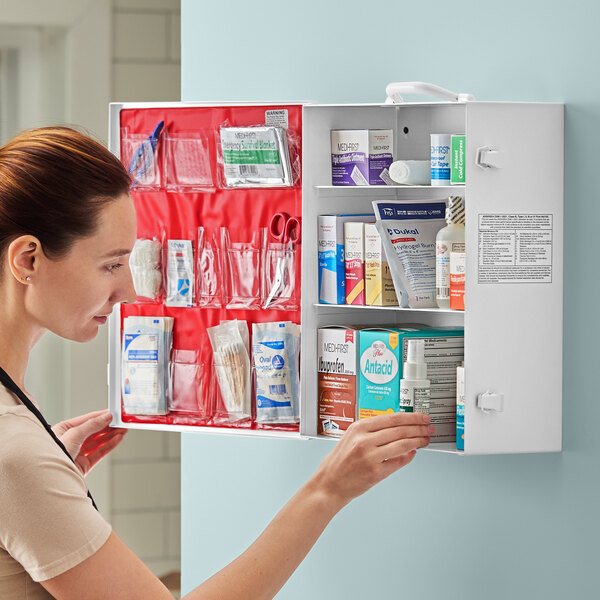 This cabinet features side latches to keep it shut and a carrying handle for easy mobility when you need to bring the kit to the injured person.