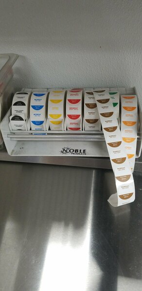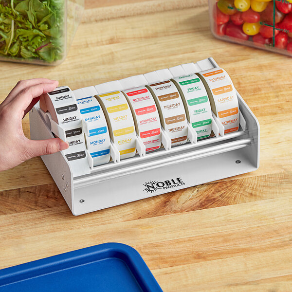 Provide your restaurant, bakery, or catering service with optimum organization and efficiency with this Noble elevated 7-slot label dispenser kit! This kit comes complete with 7 separate rolls of dissolvable day-of-the-week label labels - a roll for every day of the week.