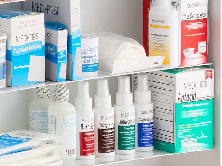 We bought this exact first aid cabinet for your employees break room. We found that it contains everything you might need in a pinch for the little cuts and scraps that occur. We used to have a bunch of products just thrown in a box but this cabinet keeps everything organized and you always know where it is of course.