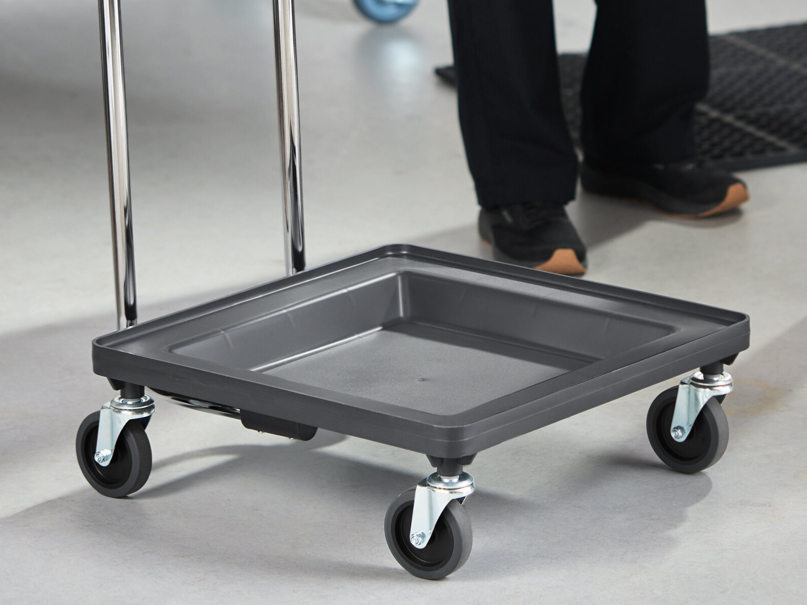 This dolly features a 21" x 21" square design with an indented surface to securely hold standard size glass racks from all the most popular brands, including Noble, Cambro, Carlisle, and many others.