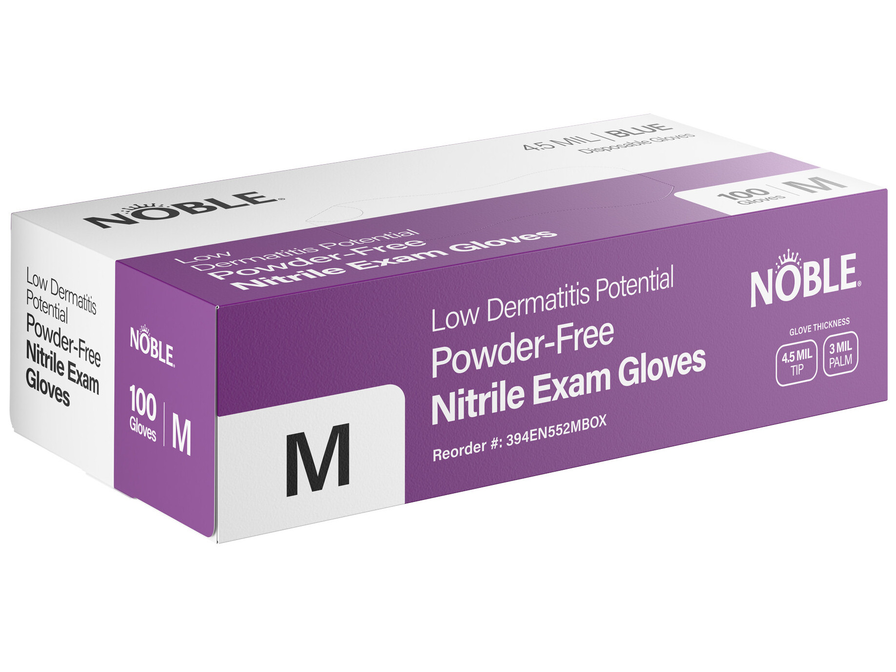 Noble low dermatitis potential 4.5 mil nitrile gloves provide exceptional puncture, tear, and chemical resistance. Thanks to textured fingertips, they also provide a firm grip in both wet and dry situations. They are ideal for food service operations, janitorial tasks, medical exams, dentist offices, nursing homes, veterinary clinics, and schools.