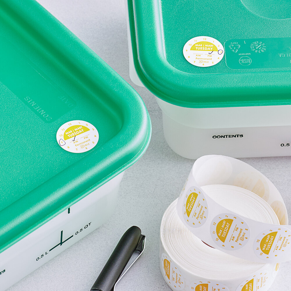 Each label features a 12-hour clock design and blanks for AM and PM so that an item can be labeled for the specific time of the day it was made. Plus, the bold lettering and numbers make the labels easy to mark and read. Clock labels can even be used for front-of-house applications with buffets and coffee bars so that customers can easily confirm the freshness of a particular dish or beverage.