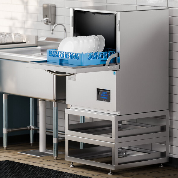 This powerful dishwasher combines with the convenience of a stand to elevate the machine and reduce strain, creating an ideal asset for your busy foodservice establishment. It comes with two durable stainless steel stands that stack and install into one, providing a height of 17 11/16" with adjustable feet that can raise it to 18 11/16". To accommodate a variety of drain installations, the drain automatically pumps while the unit runs with a powerful, stainless steel, 1 hp wash pump. This unit requires a 208/230V electrical connection for operation.