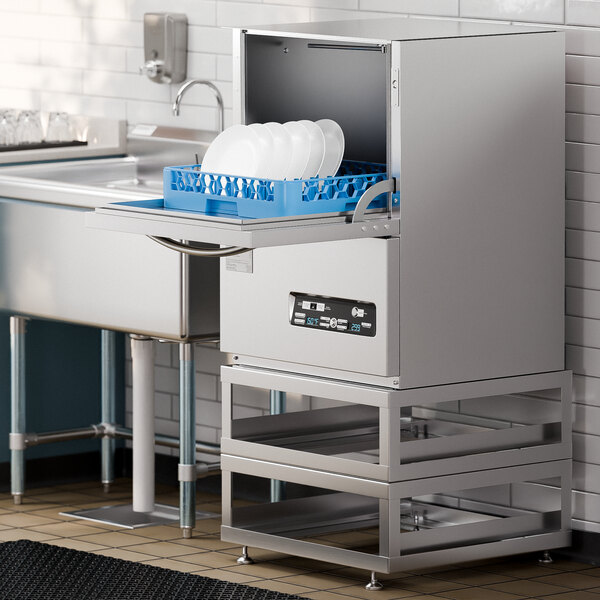 This powerful dishwasher combines with the convenience of a stand to elevate the machine and reduce strain, creating an ideal asset for your busy foodservice establishment. It comes with two durable stainless steel stands that stack and install into one, providing a height of 17 11/16" with adjustable feet that can raise it to 18 11/16". This unit requires a 208/230V electrical connection for operation.