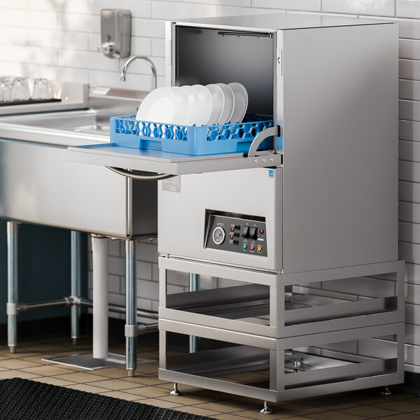 This powerful dishwasher combines with the convenience of a stand to elevate the machine and reduce strain, creating an ideal asset for your busy foodservice establishment. It comes with two durable stainless steel stands that stack and install into one, providing a height of 17 11/16" with adjustable feet that can raise it to 18 11/16". This unit requires a 115V electrical connection for operation.