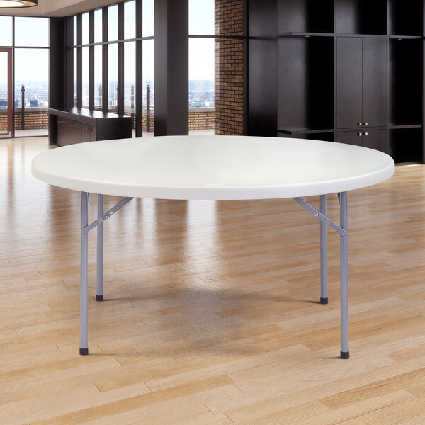 If your business is looking for new folding furniture, National Public Seating's 60" round gray plastic folding table is a great place to start. This table features a light weight yet sturdy body and is ideal for use in banquet halls, outdoor functions, and healthcare facilities. Its attractive 2" thick speckled gray plastic top also blends in well with any decor, and the 1000 lb. capacity ensures you can easily serve all of your guests' favorite foods without worry. Regardless of the type of business you own, National Public Seating's round gray plastic folding table is sure to exceed your expectations.