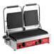 Create your most popular sandwiches, quesadillas, hamburgers, and more with the Avantco PG400T dual panini sandwich grill with timer, grooved plates, and 19 5/8" x 9 1/8" cooking surface! This sandwich grill features 3500 watts of heating power for fast and thorough cooking as well as a timer. The grooved 8 1/2" x 8 1/2" top plates and 19 5/8" x 9 1/8" bottom plates provide tantalizing grill marks for an excellent presentation. In addition, specialized hinges allow the top plate to lay flat against the food rather than at an angle, ensuring complete contact and uniform cooking, and handles on the sides make the unit safe and easy to carry.