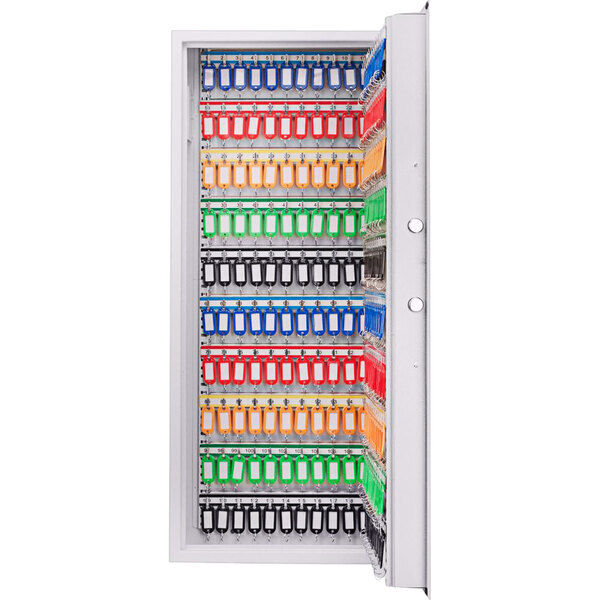 Keep keys organized and secure to streamline your operation with this Barska AX13368 15 11/16" x 4 3/4" x 34" white steel wall-mount 240-key cabinet / safe with digital keypad and key lock. This cabinet / safe has a 240-key capacity, making it perfect for busy hotels, car dealerships, banks, hospitals, or any business in need of a key storage upgrade! To keep keys neat and organized, the cabinet has 240 evenly-spaced hooks and includes convenient, numbered hook positions, as well as 240 colored key tags. Additionally, the height or spacing of the key shelves can be adjusted to achieve a custom organization that suits the needs of your business.