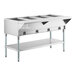 For quick and efficient start up, this unit features a straight flow, energy-saving burner assembly, with 14,000 BTU total. For optimum heating versatility, each individual well is independently controlled by an infinite control knob. This steam table is intended for dry use, but if you want to use moist heat, try pairing it with compatible spillage pans (sold separately). Simply fill your spillage pan with water and place your food pan inside. The undershelf comes in handy for storing extra serving utensils, food pans, or lids, so all of your most frequently used tools can be close at hand. For extra convenience, the polyethylene 8" deep by 1/2" thick cutting board gives you a little extra work space to prep foods, change out food pans, or fill plates. This open well steam table is a great addition to your commercial establishment.