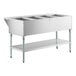 Keep all of your menu items piping hot and readily available with the ServIt GST-4WE-NG four pan open well natural gas steam table with undershelf! This powerful holding unit can hold four full size 6" deep food pans full of pasta, meat, or side dishes in each well. The wells can also accommodate various different pan configurations with the use of adapter bars, which allows you to warm multiple foods simultaneously. For all possible configurations, refer to the pan layout diagram. Each well features a high-output burner rated at 3500 BTU. The body of this unit is constructed of durable 22-gauge type 430 stainless steel and heavy-duty hardware. The top and wells are made of 20-gauge type 304 stainless steel, while the cutting board support shelves are made of 16-gauge type 430 stainless steel. Since stainless steel and galvanized steel are resistant to corrosion and rust, you can be sure that this unit will last in a busy restaurant environment if properly cared for.