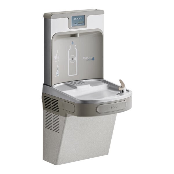 Provide your guests, customers, and staff with an easy and accessible way to quench their thirst with this Zurn Elkay LZS8WSLK ezH20 8 GPH light gray chilled hands-free filtered bottle filling station with a drinking fountain. With a light gray construction this station is sleek and durable to provide customers with easy access to water. The unit is easy to install and mounts directly on the wall to save space.