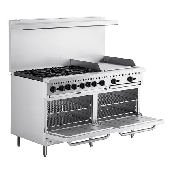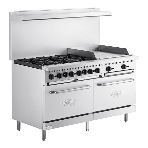 Improve your kitchen's performance with the MainStreet Equipment E60-G24-L liquid propane 6 burner 60" range with 24" griddle and 2 standard ovens! With (6) 30,000 BTU open top burners, this liquid propane range ensures you can saute, boil, and simmer your dishes to perfection. The 12" x 12" rugged cast iron grates are built to support heavy stock pots along with saucepans, fry pans, and other cookware as you slide them from burner to burner. The cast iron grates lift off to allow for thorough cleansing, while a deep pull-out crumb tray also aids in quick clean-up at the end of the day. Plus, the burners have independent controls, so you can use them for different purposes simultaneously to boost your cooktop efficiency. This unit also boasts a 2" front ledge as extra workspace and combines with a 9 3/4" deep back shelf to hold essential seasonings and supplies for convenient access.